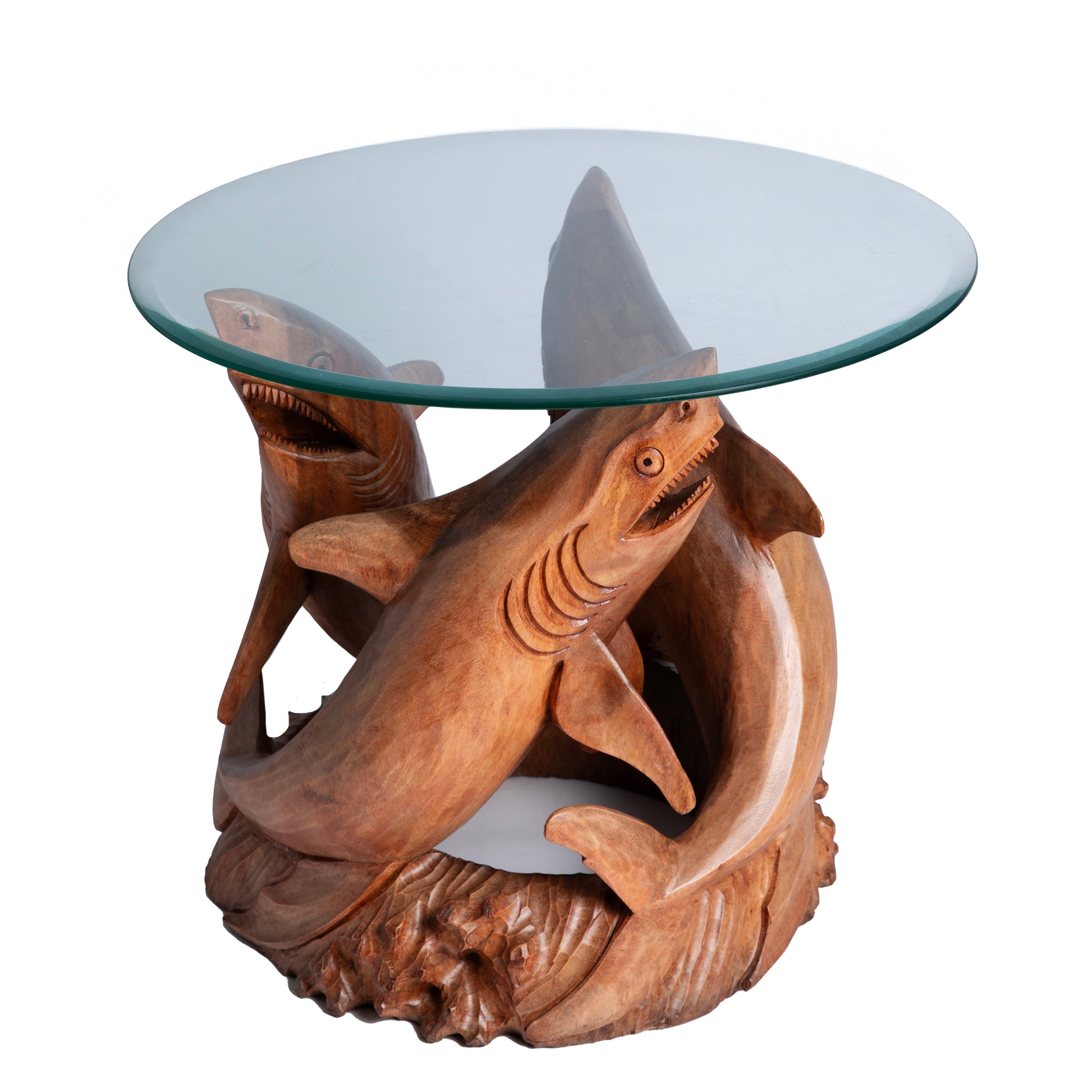 Bring the awe of the ocean into your home with this handcrafted wooden table featuring three intricately carved sharks swimming upward. Each shark is skillfully sculpted from a single piece of premium wood, capturing the natural beauty and majesty of these powerful creatures. Perfect as a coffee table or a unique piece of ocean-inspired decor, this table adds character and style to any room. This product is shipped without the glass top, allowing you to customize with a glass piece of your choice.
